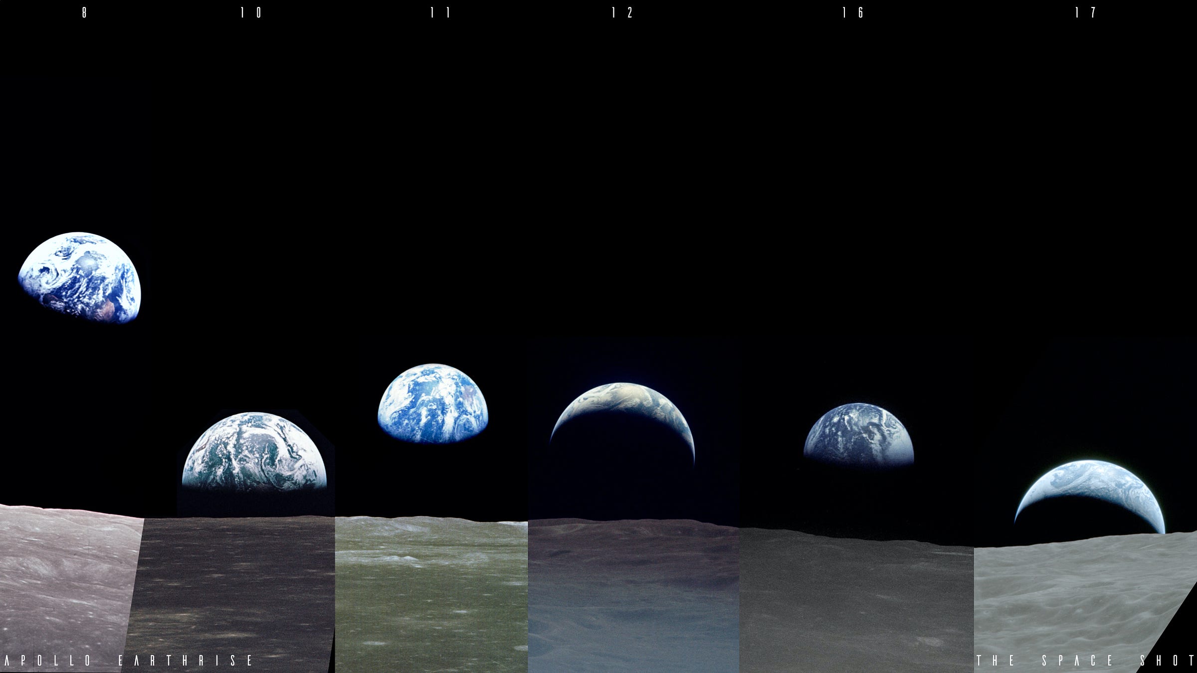 The montage below shows Earthrise images from Apollo 8-17. The Apollo astronauts used Hasselblad cameras, which were all manually operated, a testament to their training and dedication. Listen to Lovell calling out camera exposure settings during the video I embedded above.
